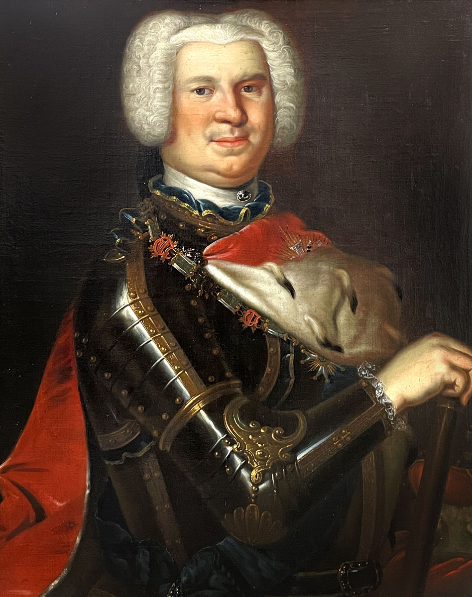 В одном нюрнбергском антикварном салоне выставлен на продажу недатированный и без указания авторства поясной портрет человека в доспехах, накинутой на левое плечо мантии, с «повелительным», как его называли в России в XVIII в. жезлом и прической, модной в 1730-40-х гг. На портрете видны инсигнии двух орденов – польского Белого орла (синяя лента через левое плечо, на конце которой, но за краем изображения, находится орденский знак и звезда, вышитая на мантии) и пфальцского (на вероятный период написания портрета, позднее – баварского) ордена Св. Губерта (на цепи на шее). Знак последнего в значительной степени скрыт мантией, но орден угадывается по внешнему виду звеньев шейной цепи. Портрет определен нюрнбергскими антикварами как изображение «герцога Августа Саксен-Эйзенахского». В истории этого германского герцогства не было правителя с именем «просто» Август, но по времени правления наиболее подходят отец и сын герцоги Эрнст-Август I (правил в 1741-48 гг.) и Эрнст-Август II (правил в
