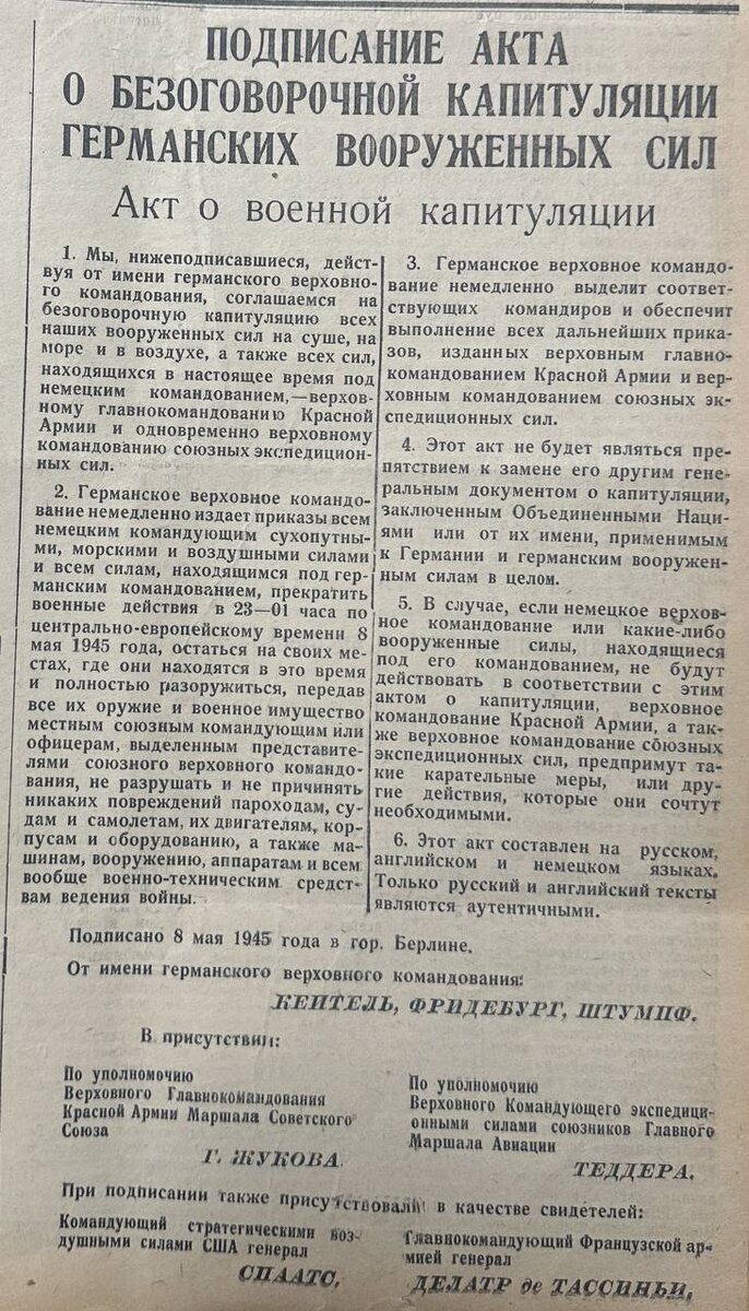 РИА «Карачаево-Черкесия» стало партнером просветительского проекта Дзен к 80-летию Великой Победы, в рамках которого будут опубликованы материалы, выходившие в газете «Красная Черкессия» (сегодня это «День республики») в 1945 году. Мы расскажем, чем жила Карачаево-Черкесия с 8 апреля по 9 мая 1945 года и как она встретила долгожданную Победу. 8 мая 1945 года подписан окончательный Акт о безоговорочной капитуляции Германии, а 9 мая объявлено Днем Победы. В праздничном выпуске газеты «Красная Черкессия» за 9 мая был опубликован текст подписанного Акта. Он содержал следующие условия: – Германия признала полную и безоговорочную капитуляцию всех вооруженных сил на суше, море и в воздухе перед союзниками; – Военные действия прекращались 8 мая в 23:01 по центральноевропейскому времени. Все войска должны были остаться на местах, сдаться и передать оружие; – Германское командование обязано было подчиняться всем дальнейшим приказам союзников; – В случае нарушения условий союзники оставляют за с