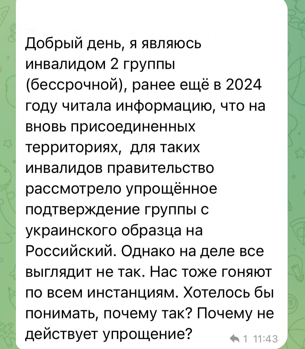 Правительство упростило этот процесс для жителей новых регионов, но на практике всё работает совсем по-другому. Последние новости Запорожья от 7 мая. Сегодня, 7 мая, в редакцию «Блокнот Запорожья» обратилась местная жительница. По словам женщины, она является инвалидом II группы. Однако заменить украинские документы на российские и получить переосвидетельствование запорожанка так и не смогла. Ранее правительство упростило процесс переоформления бессрочных документов об инвалидности для жителей ДНР, ЛНР, Запорожской и Херсонской областей. Это относится ко взрослым, чьё инвалидное состояние было обнаружено до 1 марта 2023 года, а также к детям до 18 лет, имеющим инвалидности. По сути, гражданам должны просто подтвердить группу инвалидности при замене документов. Но на деле, как оказалось, всё не так просто. Женщина рассказала, что её просто «гоняют по всем инстанциям». Почему упрощение не действует – непонятно. Логично предположить, что без документов об инвалидности запорожанка не может