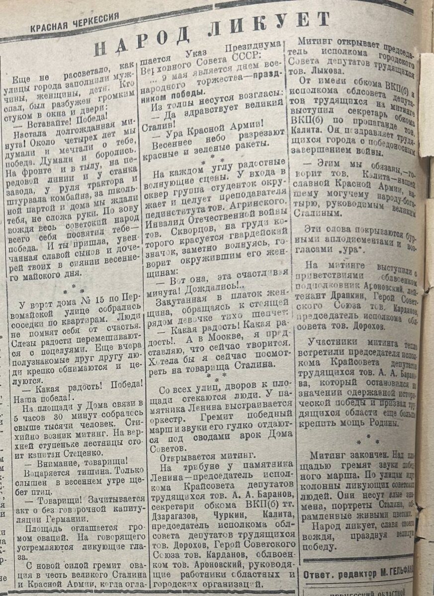 РИА «Карачаево-Черкесия» стало партнером просветительского проекта Дзен к 80-летию Великой Победы, в рамках которого будут опубликованы материалы, выходившие в газете «Красная Черкессия» (сегодня это «День республики») в 1945 году. Мы расскажем, чем жила Карачаево-Черкесия с 8 апреля по 9 мая 1945 года и как она встретила долгожданную Победу. Еще не рассветало, как улицы города заполнили мужчины, женщины, дети. Кто спал, был разбужен громким стуком в окна и двери: – Вставайте, победа! Настала долгожданная минута. Около четырех лет мы думали и мечтали о тебе, победа. Думали и боролись на фронте и в тылу, на передовой линии и у станка завода, у руля трактора и штурвала комбайна, за школьной партой и дома мы ждали тебя, не сложа руки. По зову вождя весь советский народ всего себя посвятил тебе – победа. И ты пришла, увенчанная славой сынов и дочерей твоих в сиянии весеннего майского дня. У ворот дома № 15 по Первомайской улице собрались соседки по квартирам. Люди не помнят себя от счасть