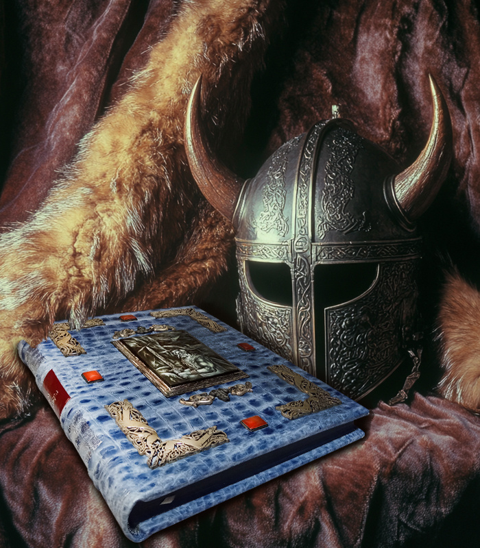 Особенность этого издания — полная гармония содержания и оформления. Каждая страница украшена цветными скандинавскими орнаментами, которые переносят вас в эпоху викингов. Иллюстрации, специально созданные для этого издания, отражают суровый дух того времени. Это произведение буквально пропитано энергией севера. Французский цельнокожаный переплет ручной работы изготовлен из синей кожи «крокодил» (фирма «Винтер», Англия). Ювелирные украшения из серебра 925 пробы (вес 597 граммов), с чернением. Четыре камня Сердолик сычуаньский (Китай) в огранке «кабошон», делают его