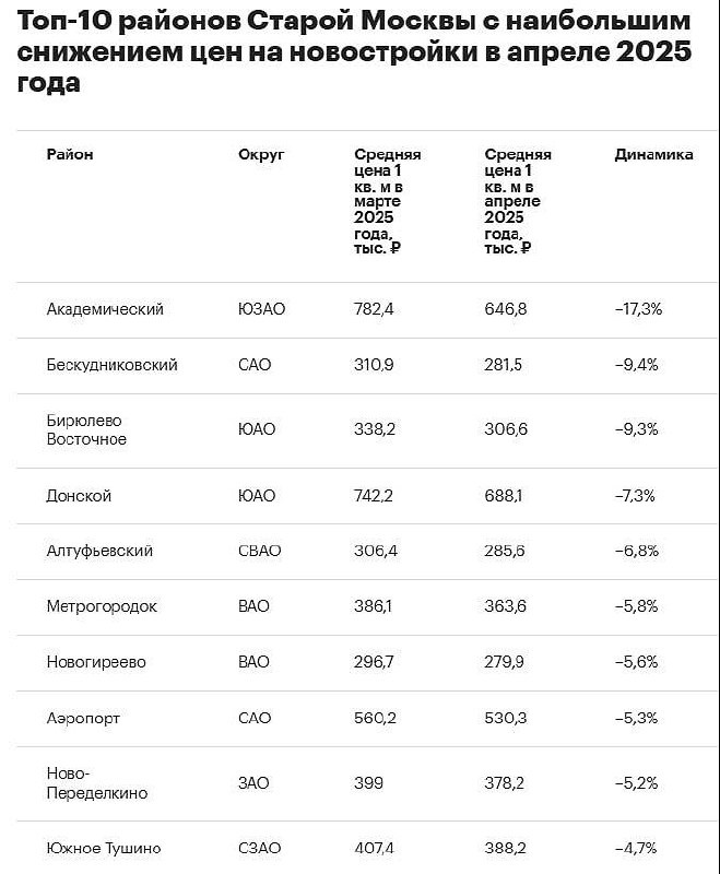 ⚡️ Где в Москве сильнее всего просели цены на новостройки — РБК Академический район стал лидером по снижению средней цены за м² — –17,3% за апрель. В марте здесь были только проекты комфорт- и бизнес-класса, а в апреле добавились более дешёвые — средняя цена опустилась до 646,8 тыс.₽/м². Следом по убыванию: 👉 Бескудниковский — –9,4%, до 281,5 тыс.₽ 👉 Бирюлево Восточное — –9,3%, до 306,6 тыс.₽ 👉 Донской — –7,3%, до 688,1 тыс.₽ 👉 Алтуфьевский — –6,8%, до 285,6 тыс.₽