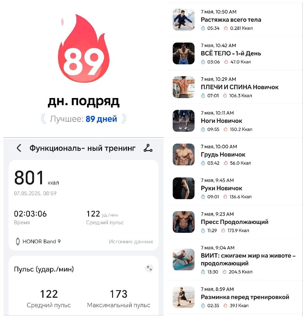 🏋️♂️ Упражнения. День 89. 🗓 07.05.25 💪 День ведения блога: 119 ⏱ 02:03:06 🏄♂️ 801 ккал 💪 Усиленный комплекс на 2 часа сделан! 🧐 Мне кажется на данный момент я подобрал себе оптималтную нагрузку. 😃 Нашёл в приложении комплекс на все тело, включу его в постоянную программу 😏 Ну после хорошей нагрузки, можно принять я за завтрак и дела. ✍️ Рассказывайте о своих достижениях в коментах! #упражнения_дома 😎 Roman Legas | Life