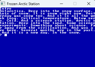 Приключение. На Кб64. В ретро стиле. Специально весь графический стиль сделан из синего фона. И белого цвета. Белый цвет – это рисунки линиями. И текст. Цвет заморозки. Снега и льда. Холодный такой цвет. Эта разработка была в голове очень давно. На уровне картинки в голове. Момент реализации таких идей настал. Какие-то идеи, которые хотелось реализовать. И эти компьютерные игры вот сейчас и делаю. Началось все с текстового квеста - недалеко от берега. Тоже идея игры, которой как говорится, сто лет. Но, только сейчас все это и делаю. Ты на далекой в снегах арктической станции. Тут всегда снег. И холод. Ты на станции. Делаешь какие-то задачи. Ты не ученый. Но пишешь скрипты и типа разбираешься в компьютерах. Так что сказать, что именно там делается ты не можешь. Вот в один день. Скучный рабочий день. Ты вышел в коридор. Самый обычный. Белый коридор. С лампами сверху. Ты ходишь по нему каждый день. Это твоя зона допуска сюда. И случилось что-то неизвестное. Ты снова увидел мир спустя как