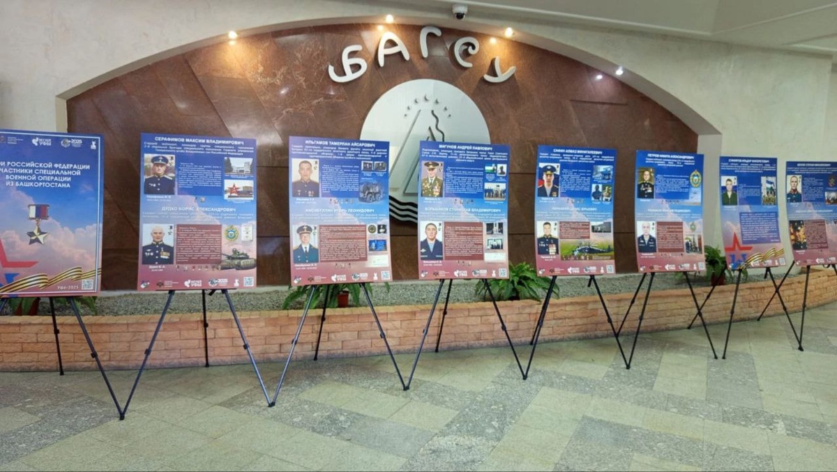 В БАГСУ проходит передвижная выставка о героях СВО Башкирии С 7 мая в БАГСУ ( Уфа, Валиди, 40) проходит передвижная выставка «Герои Российской Федерации - участники СВО из Республики Башкортостан». Ее организовал Музей истории города Уфы под эгидой регионального отделения Российского военно-исторического общества РБ. Выставка приурочена к 80-летию Победы в ВОВ и Году поддержки участников СВО и членов их семей в Башкирии. С предложением к организаторам выставки с проведением ее в стенах БАГСУ выступал в Штабе общественной поддержки в апреле Председатель Общественной палаты Башкирии Данияр Абдрахманов.