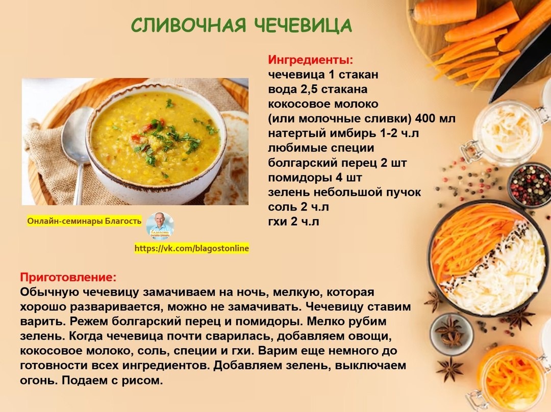 🥣 СЛИВОЧНАЯ ЧЕЧЕВИЦА 🌀 Ингредиенты: чечевица 1 стакан вода 2,5 стакана кокосовое молоко (или молочные сливки) 400 мл. натертый имбирь 1-2 чайные ложки любимые специи болгарский перец 2 шт. помидоры 4 шт. зелень небольшой пучок соль 2 чайные ложки гхи 2 столовые ложки 🌀 Приготовление: Обычную чечевицу замачиваем на ночь, мелкую, которая хорошо разваривается, можно не замачивать. Чечевицу ставим варить. Режем болгарский перец и помидоры. Мелко рубим зелень. Когда чечевица почти сварилась, добавляем овощи, кокосовое молоко, соль, специи и гхи. Варим еще немного до готовности всех ингредиентов. Добавляем зелень, выключаем огонь. Подаем с рисом.