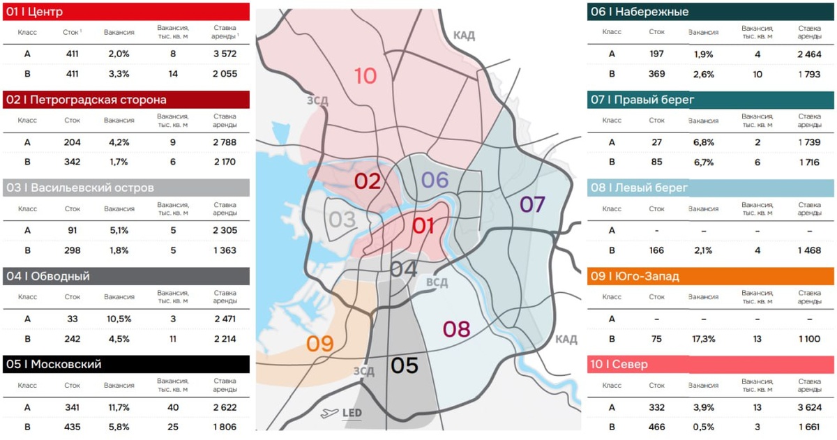 Деловые районы Санкт-Петербурга После новости о строительстве «Петербург-Сити» я решил углубиться в тему коммерческой недвижимости города. В Санкт-Петербурге сформировалось несколько ключевых деловых районов и коридоров, где сосредоточена коммерческая недвижимость, офисы крупных компаний и бизнес-инфраструктура. Общее предложение на рынке достигло 4,5 млн кв. м, из которых 2,9 млн кв. м (более 60%) приходится на класс «A» (— новые высококлассные офисы с высоким уровнем комфорта и более качественным инженерным оснащением) и 1,7 млн кв. м — на класс «В» (— качественные офисы, часто бывшие здания класса «A», без передовых технологий). С начала 2025 года в Санкт-Петербурге ввели 58 тыс. кв. м офисных площадей, что вдвое больше, чем за аналогичный период 2024 года. Большая часть введенных объектов — класс «A». При этом, более 80% от квартального объема ввода обеспечил бизнес-центр «Северная Пальмира» (48 тыс. кв. м). Крупнейшей сделкой 1 квартала 2025 года стала продажа 12 тыс. кв. метр