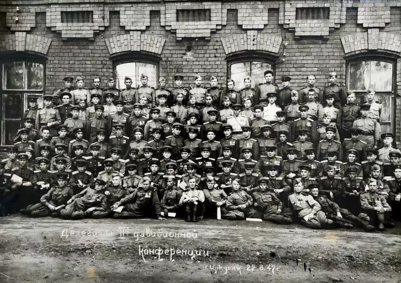Групповое фото делегатов II-й дивизионной конференции, 22 августа 1947 года. Иркутская область, город Иркутск. Автор (предположительно): Речкин В.А. Долго искал в интернете, но нашел только вот эту конференцию, которая проходила в то время: