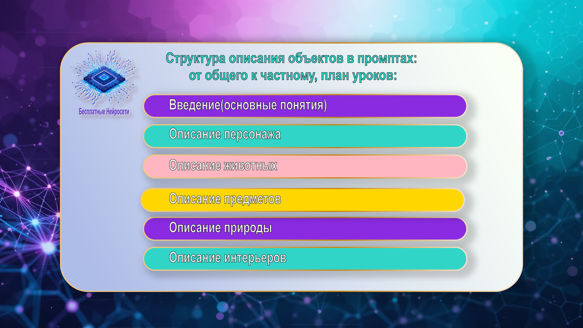 Здравствуйте, прежде чем начать урок,хочу сделать небольшое отступление, когда составляла план уроков для новичков по генерации изображений в нейросетях,этот урок казался мне простым и я сделаю разбор темы без воды, но когда стала составлять сценарий, поняла,что тема намного глубже и серьезнее. Этот урок у меня вылился в 6 подтем. В них мы рассмотрим - 1. Введение( разберем основные понятия) 2. Описание персонажа 3. Описание животных 4. Описание предметов 5. Описание природы 6. Описание интерьеров. И так на этом уроке мы познакомимся с несколькими ключевыми понятиями, которые помогут вам создавать более выразительные и интересные иллюстрации. В этой таблице мы видим основные принципы построения промта для всех объектов, которые состоят из -Основных характеристик, Общих категорий,Деталей и Контекста. Теперь подробнее рассмотрим эти определения. Основные характеристики. Это ключевые параметры, которые дают общее представление о вашем объекте. Для персонажа это может быть пол и возра