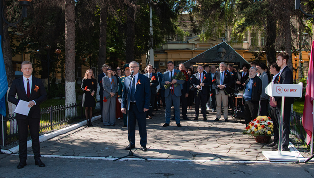 5 мая состоялись торжественный митинг и патриотический фестиваль к 80-й годовщине Победы. Преподаватели, сотрудники, студенты двух университетов, а также представители общественных организаций и военные собрались у Мемориала сотрудникам и студентам СГУ и СГМУ, погибшим в боях Великой Отечественной войны, чтобы почтить память героев. Открыл праздничную встречу ректор СГМУ А.В. Ерёмин: Сегодня по доброй традиции мы чествуем наших ветеранов. Наш митинг – возможность ещё раз вспомнить о героическом подвиге, который наш народ совершил 80 лет назад. Благодаря силе духа и самоотверженности наших солдат мы можем работать, развиваться, растить детей и просто жить. В годы войны многие сотрудники нашего университета ушли добровольцами на фронт. Одним из них был выдающийся хирург, профессор Сергей Романович Миротворцев, который в годы тяжелейших испытаний для страны работал главным хирургом госпиталей Саратовской и Пензенской областей. Собравшихся с главным праздником страны – 9 Мая – поздравил ре