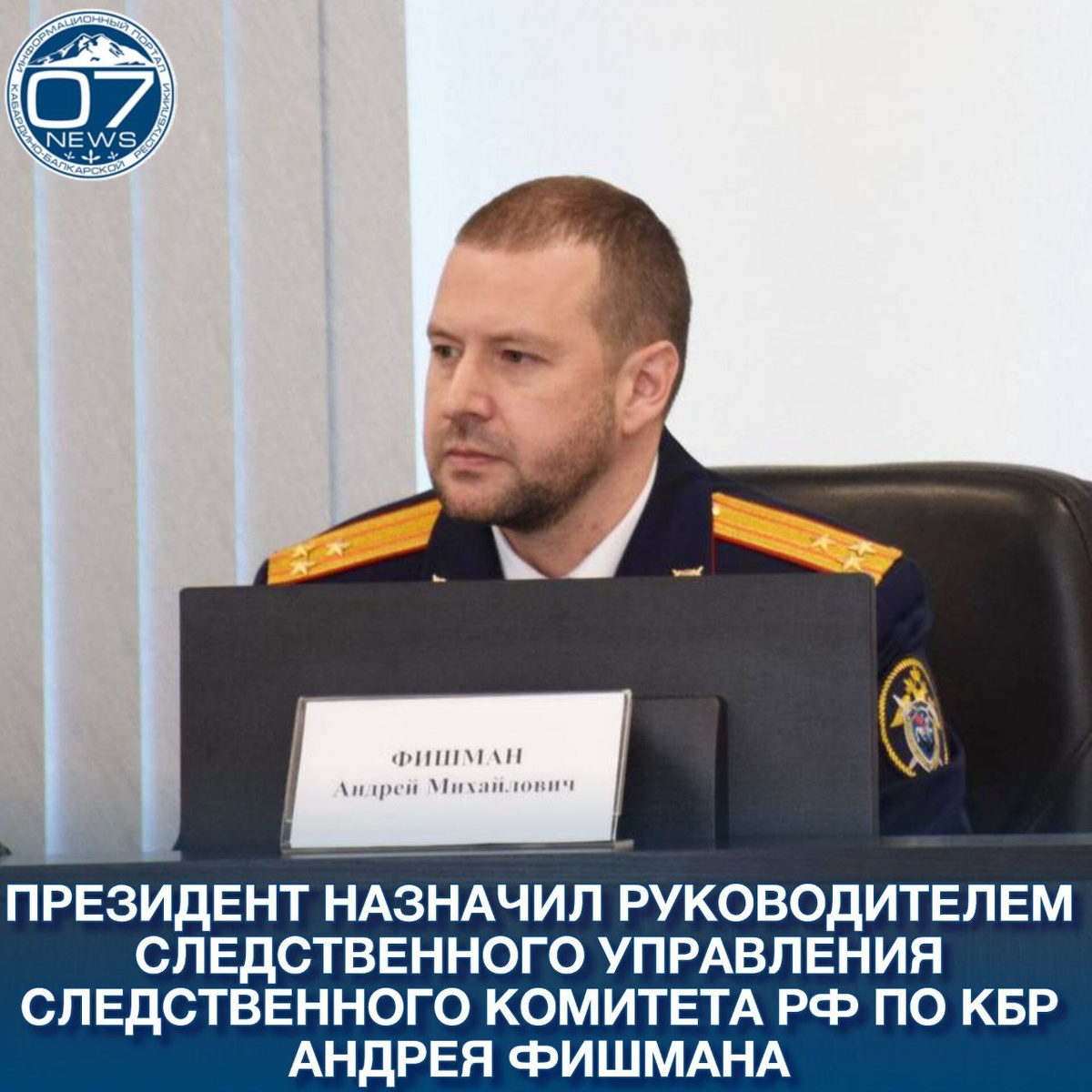 Руководителем следственного управления Следственного комитета РФ по Кабардино-Балкарии президент страны назначил полковника юстиции Андрея Фишмана, сообщили в управлении Следкома по КБР Фишмана представил руководитель управления кадров следственного ведомства Максим Малышкин. Он отметил, что за плечами Андрея Фишмана большой опыт, полковник юстиции - принципиален, настоящий профессионал. Максим Малышкин также выразил уверенность, что под руководством нового главы республиканского подразделения коллектив управления будет работать эффективно. С приветственным словом выступил глава Кабардино-Балкарии Казбек Коков. Он поздравил Андрея Фишмана с назначением. В ответном слове руководитель следственного управления поблагодарил гостей, выразил признательность руководству страны и Следственного комитета России за оказанное доверие. Андрей Фишман добавил, что приложит все усилия для достижения высоких показателей в работе подразделения.