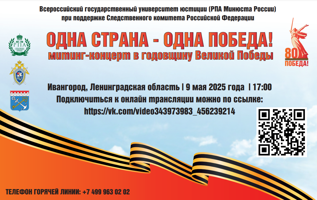 Всероссийский государственный университет юстиции при поддержке Следственного комитета РФ проведет 9 мая 2025 года в Ивангороде митинг-концерт «Одна страна – одна Победа!».