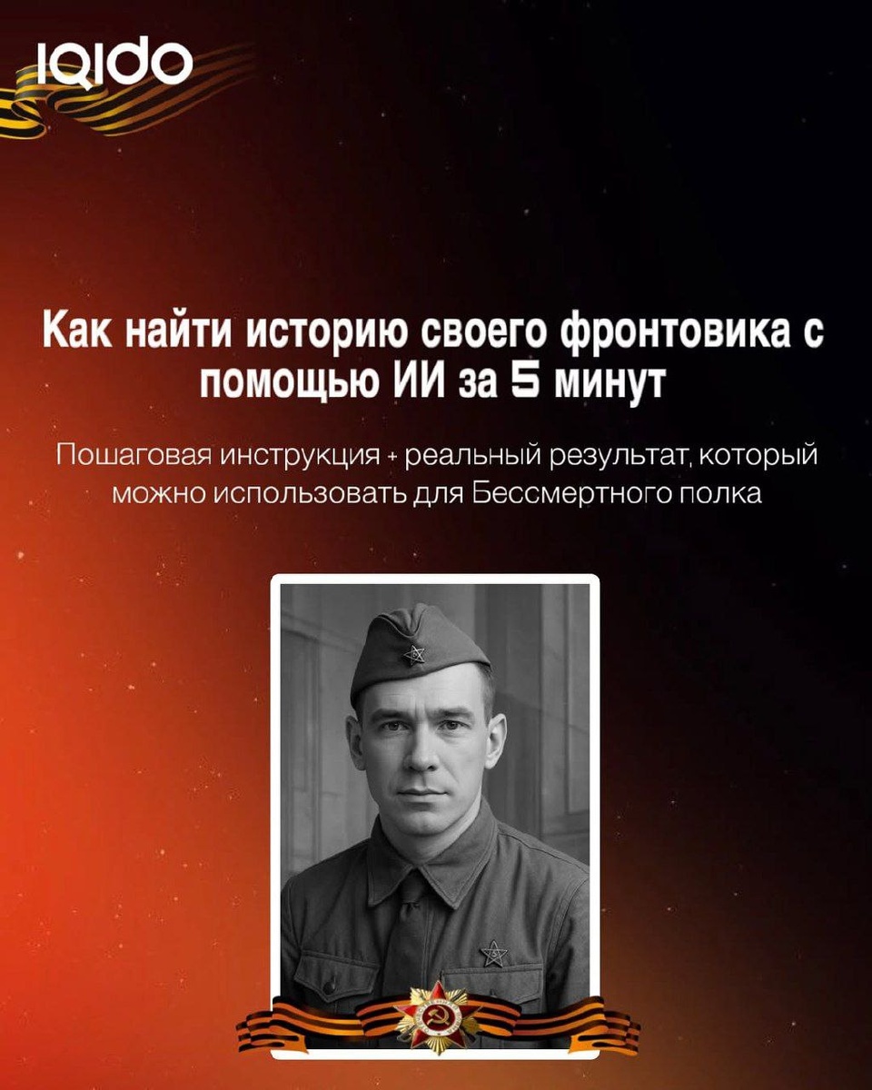 🎖 Узнайте историю своего героя за 5 минут с помощью ИИ К 9 мая мы восстановили военную судьбу прадеда: боевой путь, место гибели, даже фото — сгенерировано по семейным чертам. Всё это — благодаря нейросети. 📌 Вам нужно только:– ФИО– год рождения или место призыва– и 5 минут свободного времени ИИ сам найдёт документы, сражения, награды, точку гибели.А если фото нет — создаст его по ДНК-сходству поколений. ✨ Хотите сделать такое же? Пишите в комментариях слово “ФРОНТ” — пришлю полную инструкцию, как найти своего героя. #9мая #деньпобеды