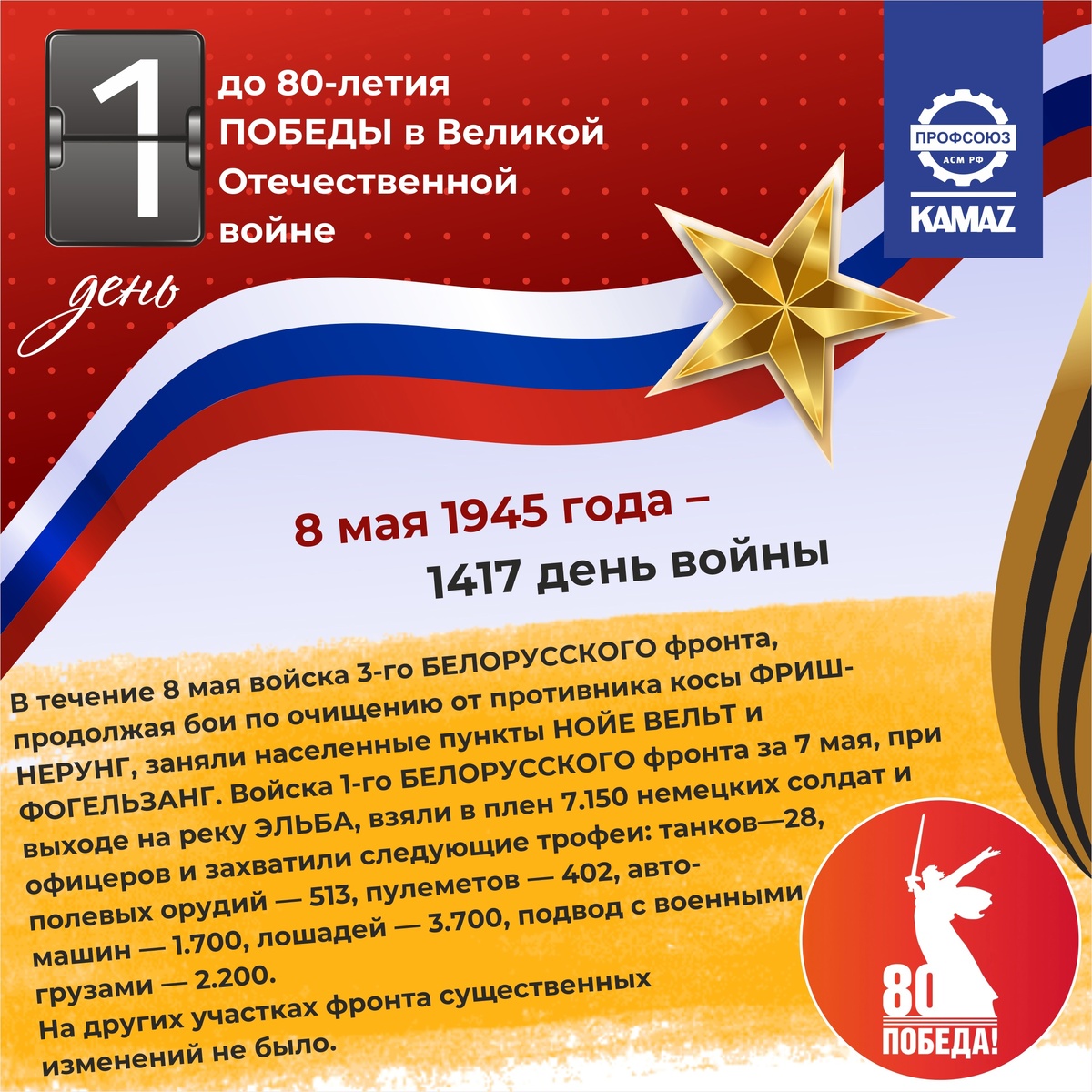 Войска 1-го БЕЛОРУССКОГО фронта за 7 мая, при выходе на реку ЭЛЬБА, взяли в плен 7.150 немецких солдат и офицеров и захватили следующие трофеи: танков—28, полевых орудий — 513, пулеметов — 402, автомашин — 1.700, лошадей — 3.700, подвод с военными грузами — 2.200.