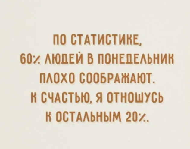 Рай – это когда нет будильников, понедельников и начальников. 📍📍📍📍📍 Когда мне говорили «Учись, работай, вечеринки твои никуда не денутся!» – это была ложь. Вечеринки как раз куда-то делись, а вот работа и учеба – нет. 📍📍📍📍📍 📍📍📍📍📍 До сих пор не понимаю, у меня сильная усталость или слабая мощность. 📍📍📍📍📍 Летом компетентность сотрудников бывает 3-х видов: