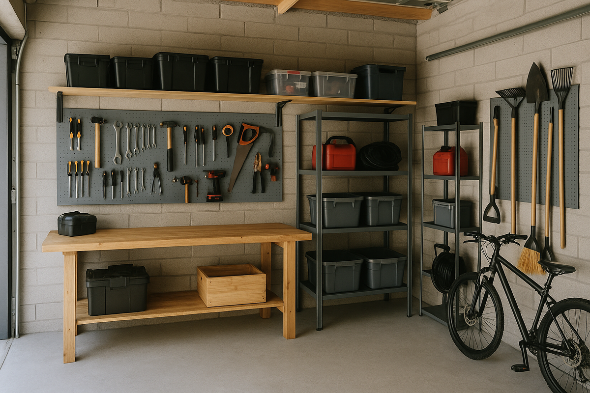 Гараж — это не просто место для стоянки автомобиля. Это мастерская, склад, ремонтная зона и порой даже убежище для уединённой работы. Правильное обустройство гаража не только делает работу комфортнее, но и экономит время, силы и деньги. В этой статье мы подробно разберём, что должно входить в базовый набор инструмента и принадлежностей для гаража, а также предложим несколько практичных решений, которые можно изготовить своими руками. 1. Рабочая зона: сердце гаража Верстак Зачем нужен: это основное рабочее место, где вы будете сверлить, паять, собирать и разбирать. Самодельный вариант: Сделать верстак можно из фанеры и бруса. Используйте столешницу из фанеры 30–40 мм, опорную раму из бруса 100×100 мм и усиливайте конструкцию металлическими уголками. Добавьте полку под инструмент и розетки по периметру. Освещение Зачем нужно: плохой свет = плохая работа. Свет должен быть ярким и равномерным. Совет: установите светодиодные панели на потолке, а также повесьте лампы над верстаком и в т