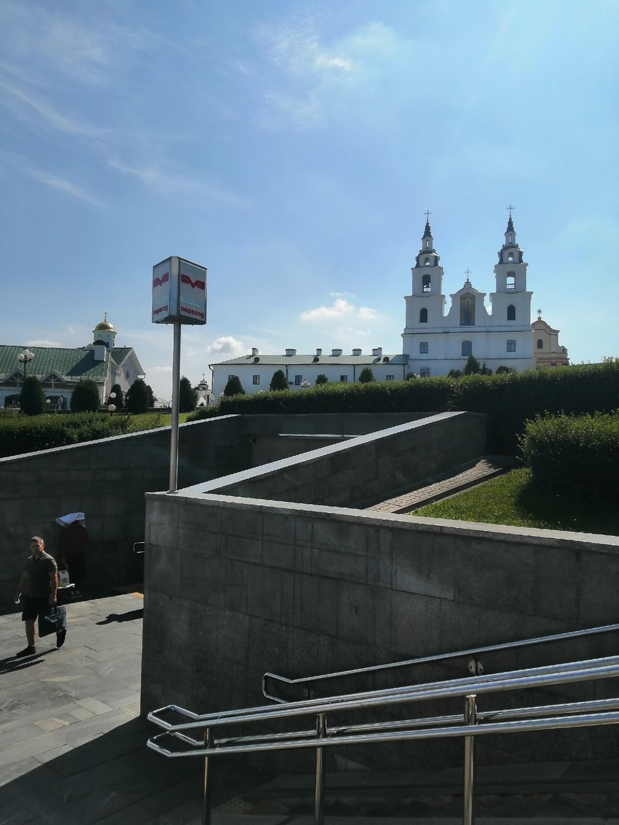 Знакомство с Минском начали,как водится,с исторического центра.Выходишь из метро -станция Немига ,и сразу видишь старинный собор. И оглядываясь по сторонам,замечаешь советского времени постройки и интересные лозунги.Переводить пытаешься,кто такие пераможцы... Минский Свято-Духов кафедральный собор.История собора началась в 1633–1642 годах, когда было построено здание, служившее храмом католического монастыря бернардинок. В 1741 году его сильно разрушил пожар, из-за чего была проведена масштабная перестройка. В 1852 году монастырь был упразднён и передан православной церкви, а в 1860 году католический костел переосвятили в православную веру. Посетив Свято-Духов Кафедральный собор,отправились неподалеку охладиться к фонтану ,в июле прошлого года Минске стояла небывалая жара . А чуть поодаль наверху обратили внимание на скамейку с металлическим гербом, оказывается это герб рода Огинских(Святой Георгий на белом коне убивает черного дракона). Присела на скамейку и услышала знак