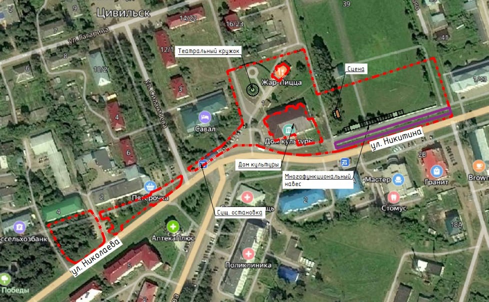 По проекту благоустройства общественного пространства возле Дома культуры в Цивильске Чувашской Республики выдано положительное заключение госэкспертизы. На реализацию данного проекта выделен федеральный грант. Территория вокруг ДК расположена на главной транспортной артерии города, улице Никитина, и является главной площадкой для городских мероприятий. Здесь планируют разместить театральный кружок, место выступлений и амфитеатр, сцену с местами для хранения реквизитов, многофункциональный навес, дождевой сад (биодренаж), публикует детали проекта Центр экспертизы Чувашии. Территория будет открыта для посетителей с ул. Никитина, ул. Николаева и ул. Маяковского: к ДК будет обеспечен круговой проезд; к театральному кружку и кафе – проезд из тротуарной плитки; к многофункциональному навесу и сцене – подъезд. Все пространство будет обустроено малыми архитектурными формами – скамейками, арт-объектами, гамаками, вазонами, детским игровым оборудованием. Планируется устройство скейт-площадки и