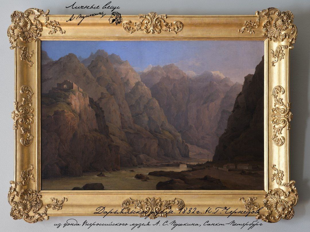 0️⃣1️⃣2️⃣ Картина «Кавказ. Дарьяльское ущелье.» художника Н.Г. Чернецова, 1851г., в проекте Digital Opera Saint-Petersburg VR-экспозиции «Личные вещи Пушкина». Известно, что в кабинете Пушкина висела картина с таким названием с авторством Никанора Григорьевича Чернецова. Она была дорога поэту как воспоминание об одном из ярких событий его жизни — путешествии на Кавказ в 1829 году. Эта поездка нашла отражение в путевых очерках «Путешествие в Арзрум», вдохновила поэта на написание «Путешествия Онегина», поэмы «Тазит», «Романа на Кавказских водах». Пушкин воспринимал природу Кавказа как нечто извечное, существующее с начала мироздания, в «Путешествии в Арзрум» он писал: «Кавказ нас принял в своё святилище. Мы услышали глухой шум и увидели Терек, разливающийся по разным направлениям. Мы поехали по его левому берегу. <...> Чем далее углублялись мы в горы, тем уже становилось ущелие. Стеснённый Терек с ревом бросает свои мутные волны чрез утесы, преграждающие ему путь. Ущелие извивается вд