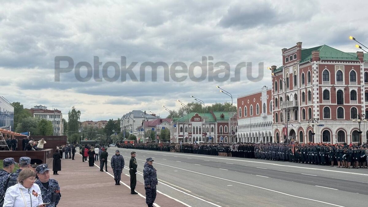 В центре Йошкар-Олы проходит генеральная репетиция парада, посвященного 80-летию Победы в Великой Отечественной войне. Красивое зрелище. Напоминаем, что он состоится 9 мая в 11:00.
