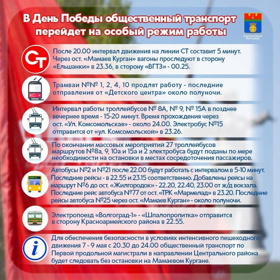 7 и 8 мая в связи с проведением патриотического мероприятия «Свет Великой Победы» предусмотрены дополнительные рейсы. Так, автобус №77 отправится от остановки «ТРК «Мармелад» в 23:20, а автобус №25 совершит последние рейсы через остановку «Мамаев Курган» в сторону Тракторозаводского и Советского районов примерно в полночь. Этот режим работы сохраняется и 9 мая. Также 9 мая скоростной трамвай отправится с станции «Мамаев Курган» в направлении «Ельшанки» в 23:36, а до «Стадиона «Монолит» — в 00:28, до «ВГТЗ» — в 00:12. В поздние часы 9 мая ожидается повышенный пассажиропоток, поэтому работу автобусов и электротранспорта будет дополнительно усилена.