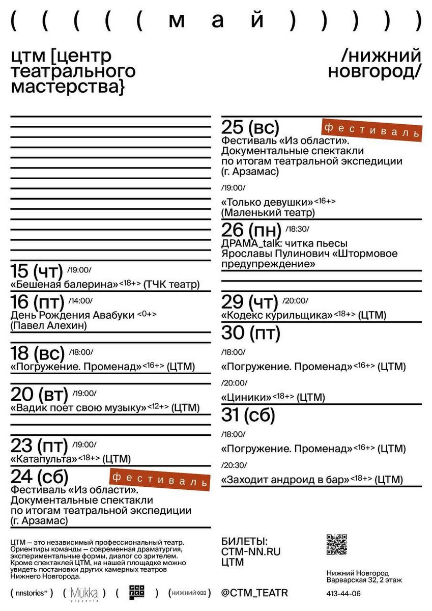 ⚡️ Афиша от Центра театрального мастерства на май 15 — Бешеная балерина 16 — День Рождения Авабуки (0+) 18 — Погружение. променад 20 — Вадик поёт свою музыку (12+) 23 — Катапульта 24 - 25 — Фестиваль «Из области». Документальные спектакли по итогом театральной экспедиции (г. Арзамас) 25 — Только девушки 26 — ДРАМА_talk: читка пьесы Ярославы Пулинович «Штормовое предупреждение» 29 — Кодекс курильщика 30 — Погружение. променад — Циники 31 — Погружение. променад — Заходит андроид в бар 🎫 Билеты уже в продаже на сайте: https://ctm-nn.ru/afisha-ctm/ Успей забрать свое место в зрительном зале!