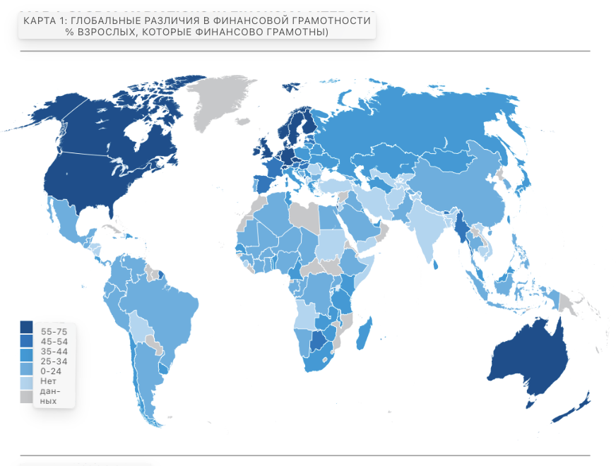 Дания и Норвегия могут похвастаться процентом финансово грамотных взрослых (71%), который значительно выше, чем в среднем по всему миру, в то время как развивающиеся страны по всей Восточной Европе, Ближнему Востоку, Северной Африке, Африке к югу от Сахары, Южной Азии и Юго-Восточной Азии ниже и без того относительно низкого среднего по всему миру.