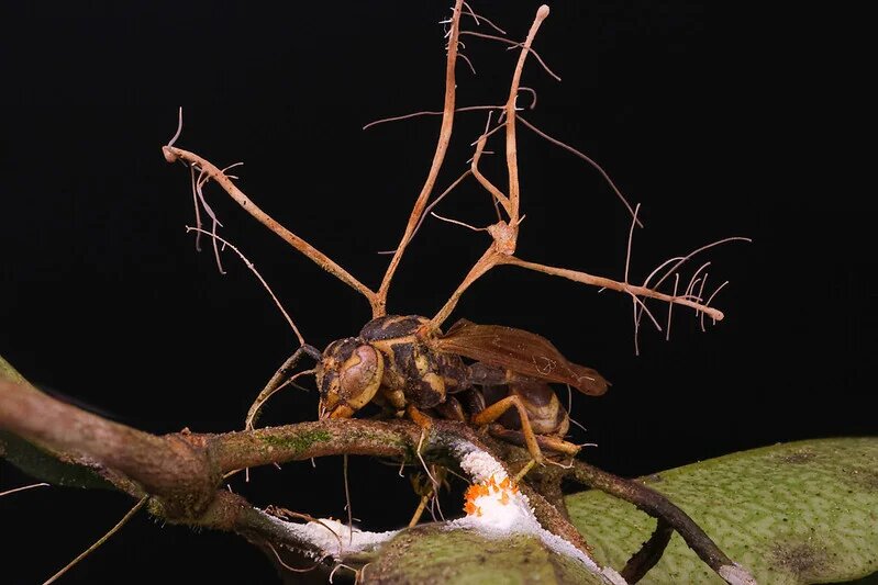 Привет, мои дорогие любители необычной земной природы. Сегодня у нас грибной выпуск, и мы расскажем о настоящем террористе грибного царства, жизнь которого могла бы послужить сценарием к остросюжетному фильму. Итак, друзья, знакомьтесь – кордицепс военный (Cordyceps militaris), представитель рода грибов, который выработал довольно оригинальные привычки и стратегию выживания в нашем сложном и жестоком мире. Этот гриб имеет два цикла жизни. В первом споры оставленные предыдущими поколениями лежат земле и ждут своего часа, когда возле них появятся подходящие насекомые. "Почуяв" "хозяина", спора цепляется за него и отращивает особую иглу, наподобие иглы шприца, которая пробивает хитиновый панцирь насекомого и по которой гриб попадает внутрь организма. Дальше начинается борьба за власть. Иммунитет хозяина сопротивляется, однако, гриб постепенно обретает контроль над нервной системой и обменом веществ жертвы, а потом убивает её, и начинает проращивать свои плодовые тела, которые производят с