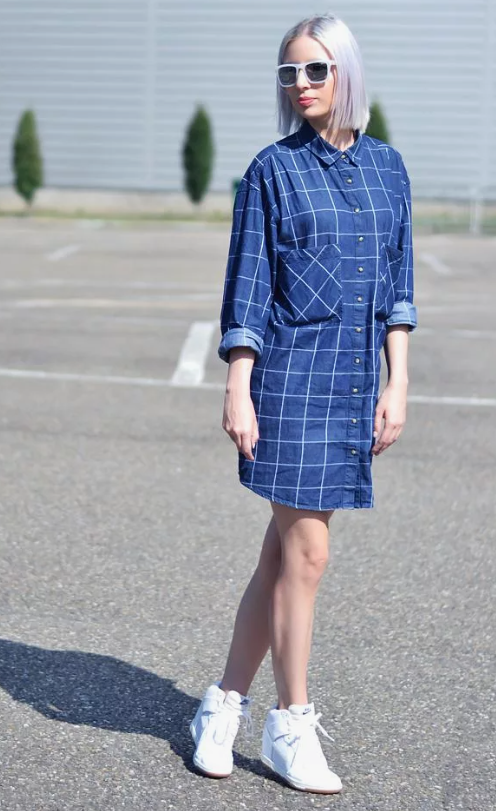 Белое платье‑рубашка в паре с белыми кедами — безопасная классика, но почему бы не поиграть? Полоска тонкая вертикальная — уже плюс пять сантиметров роста. Клетка «виши» дарит настроение ретро‑пикника. Однотонный хаки делает образ чуть более городским, особенно если добавить золотые серьги‑кольца. С цветом действуем по правилу: яркое платье — спокойные кеды, нейтральное платье — можем позволить яркую обувь или носки с забавным акцентом.
