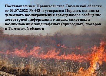 Сообщи о виновниках пожара Департамент безопасности жизнедеятельности администрации города Тюмени напоминает жителям и гостям города, что в соответствии с постановлением Правительства Тюменской области от 01.07.2022 № 448-п утвержден Порядок выплаты денежного вознаграждения гражданам за сообщение достоверной информации о лицах, виновных в возникновении ландшафтных (природных) пожаров в Тюменской области, и (или) за содействие задержанию указанных лиц правоохранительными органами. Согласно утвержденному порядку за сообщение достоверной информации, на основе которой будет установлен виновник возникшего ландшафтного (природного) пожара, положена выплата в размере 40 тысяч рублей. Гражданину, содействовавшему задержанию правоохранительными органами лиц, виновных в возникновении ландшафтных (природных) пожаров – 50 тысяч рублей. Если вы обнаружили природный пожар, немедленно сообщите об этом в службу спасения по телефону «01», «101» или «112»!
