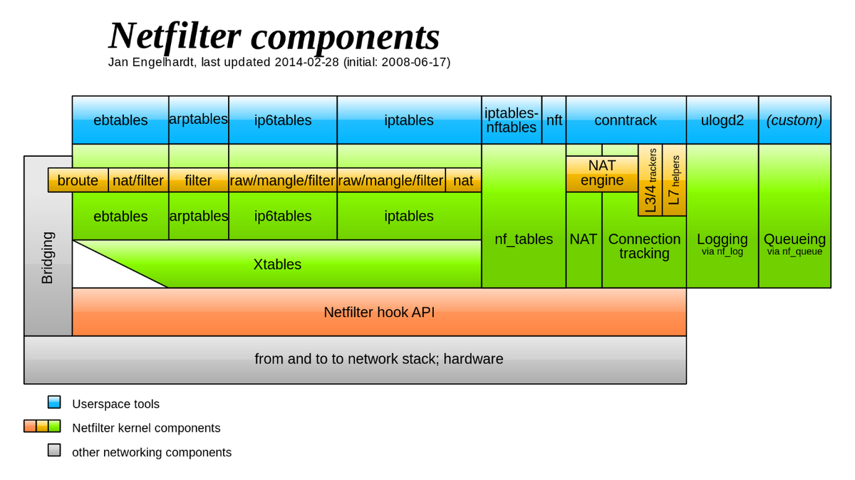 Во-первых, давайте разграничим понятия утилиты iptables и подсистемы iptables, состоящей из модулей ядра. Более точно говорить о Xtables, включающей iptables (IPv4), ip6tables (IPv6), arptables (ARP) и etables (Ethernet). В отличие от этого, в nftables всё проще: единая подсистема сетевой фильтрации работает со всеми протоколами, а утилита называется nft. Для понимания архитектуры рекомендуется ознакомиться со схемой устройства подсистемы Netfilter в Linux.