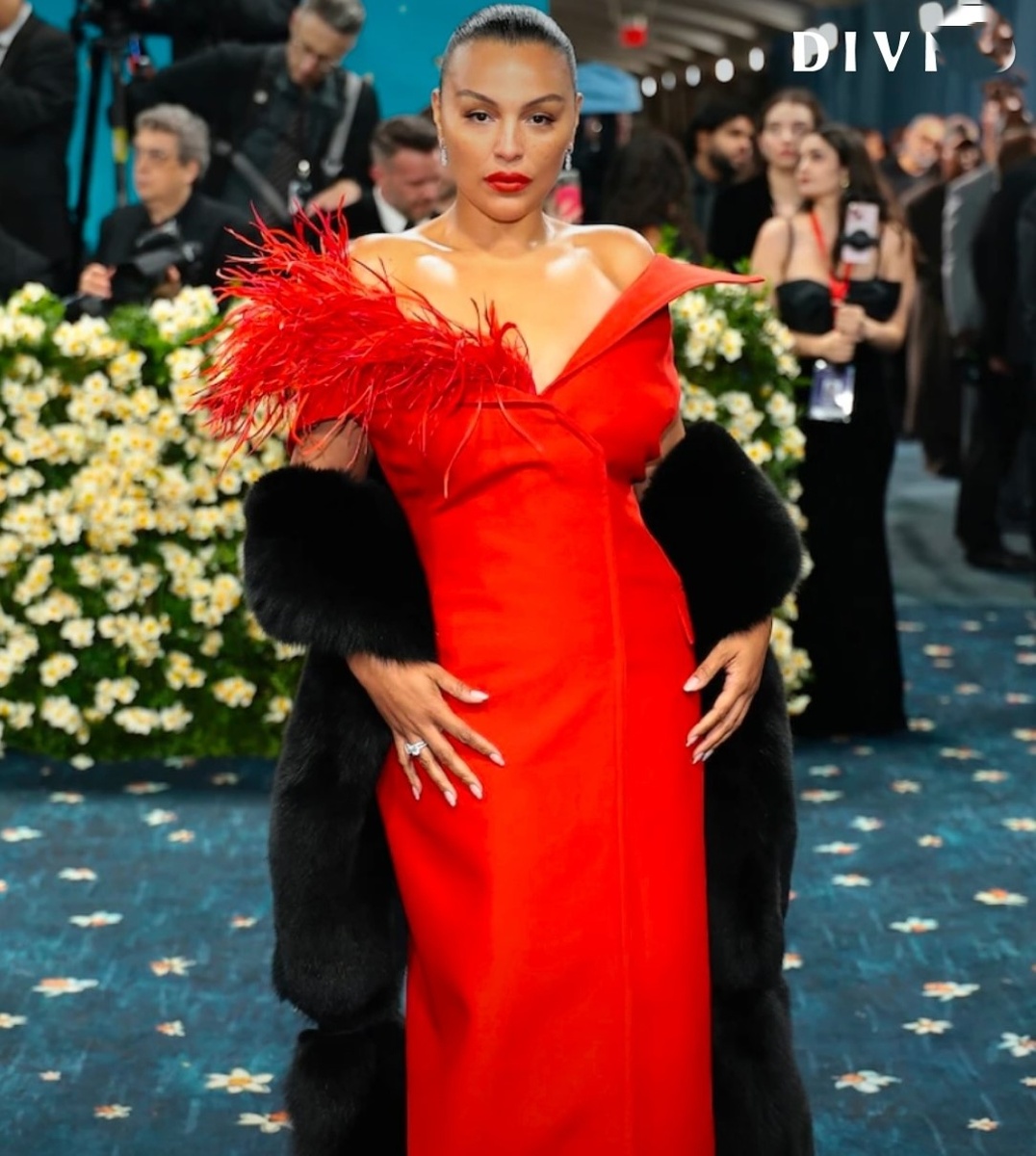 Алое платье, перья, меховой палантин, гладкие волосы и алые губы. По описанию звучит эпично, но то, что мы видим на фото больше напоминает какой-то красный комочек