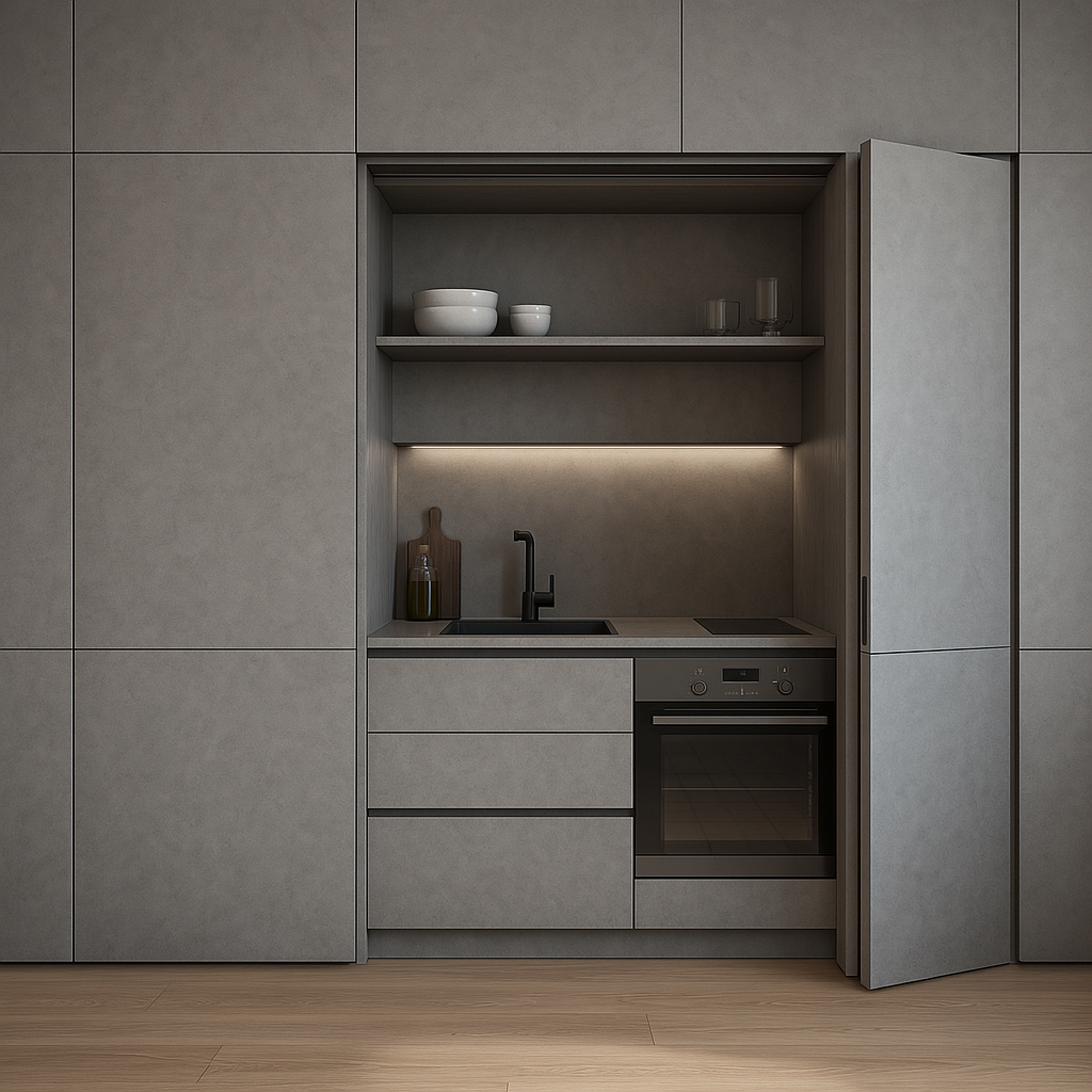 Современный интерьер стремится к минимализму, чистым линиям и функциональности. Один из главных трендов 2025 года — скрытые кухни и интегрированные зоны, которые позволяют создать ощущение простора, уюта и визуального порядка. Это особенно актуально для студий, квартир с открытой планировкой и современных офисов. Скрытая кухня — это пространство, где рабочая зона может быть полностью закрыта от глаз. Она маскируется за фасадами, раздвижными панелями или даже "исчезает" в стене. Такая кухня не выбивается из общего стиля интерьера и зачастую становится дополнением к жилому пространству, а не отдельной утилитарной зоной. Почему это становится трендом? HPL (High Pressure Laminate) — идеальный выбор для оформления скрытых кухонь и функциональных зон: Мы выбрали декор «Серый техно» (артикул LM 0009) — универсальный, современный и отлично подходящий для концепции скрытой кухни. Он передаёт ощущение урбанистичности и технологичности, что делает его идеальным выбором для минималистичных и функц
