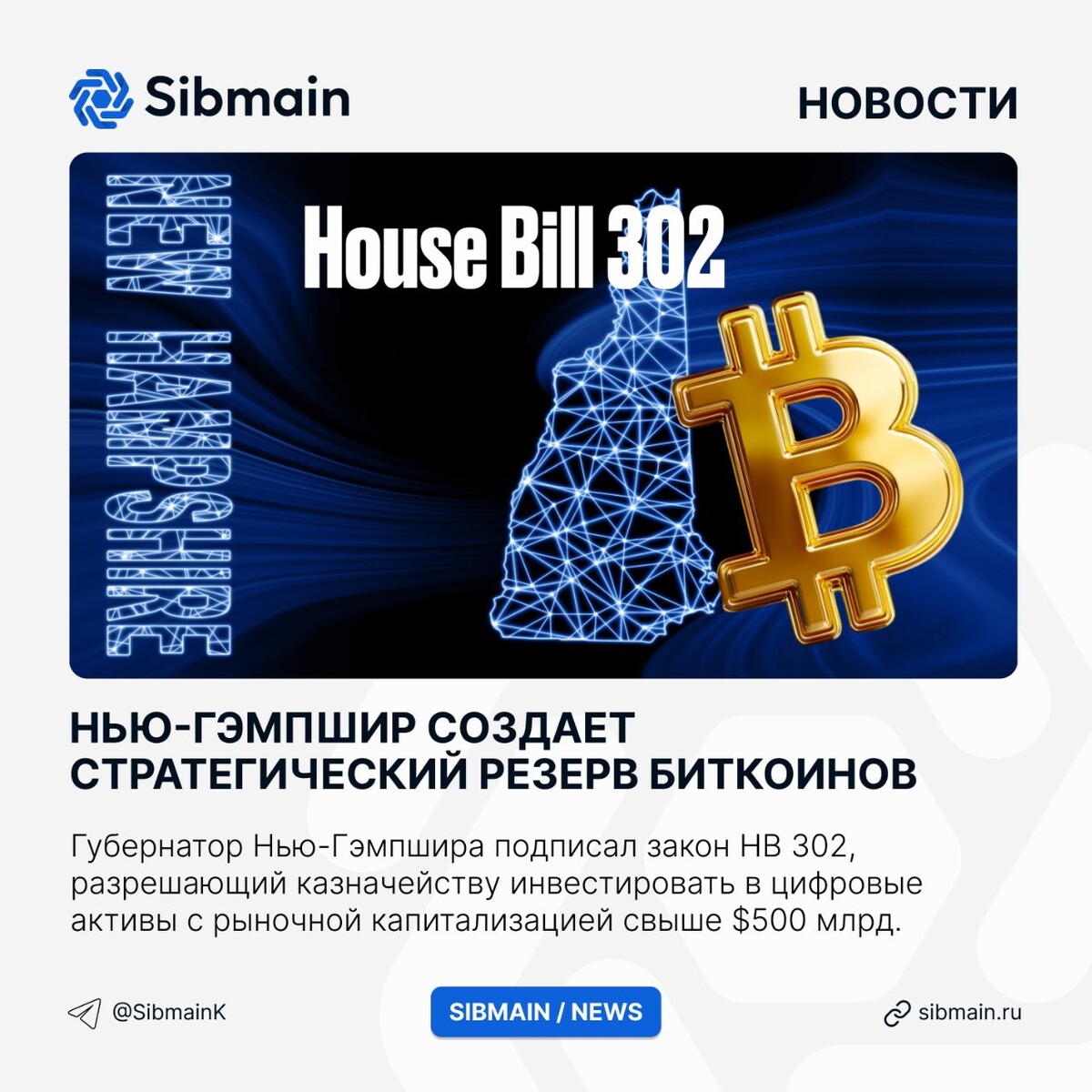 📰📰📰📰 ➡️Нью-Гэмпшир создает стратегический резерв биткоинов Губернатор Нью-Гэмпшира подписал закон HB 302, разрешающий казначейству инвестировать в цифровые активы с рыночной капитализацией свыше $500 млрд. Закон позволит казначейству: ⏺Инвестировать в биткоин ⏺Диверсифицировать резервы ⏺Увеличить доходность Закон HB 302 вступит в силу через 60 дней, формирование биткоин-резерва запланировано на июль. 📍Нью-Гэмпшир стал первым штатом в США, принявшим закон о стратегическом крипторезерве, на позитивном фоне первая криптовалюта вернулась к уровню $97 000. Sibmain комплексные решения для майнинга под ключ! - Поставки майнинг оборудования - Дата-центр в Красноярске 80 МВт - Размещение от 5 руб/кВтч ⌨️ Нужна консультация или помощь в подборе оборудования? Звоните: +7(800)351-14-70 📍 г. Москва Калужская площадь д.1 к.1 💬 WhatsApp 💬 @Sibmain_salesbot 🌐 sibmain.ru