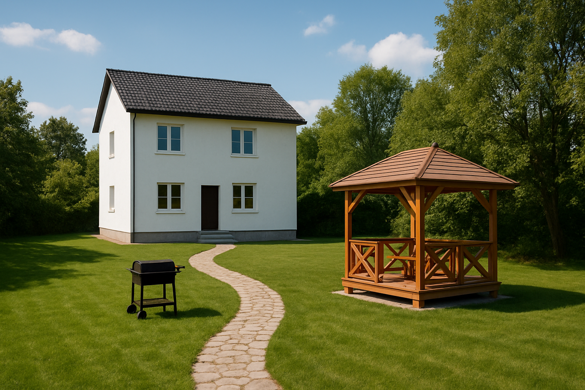 Добавьте беседку, обвитую зеленью или розами — и ваш участок сразу станет уютнее.
