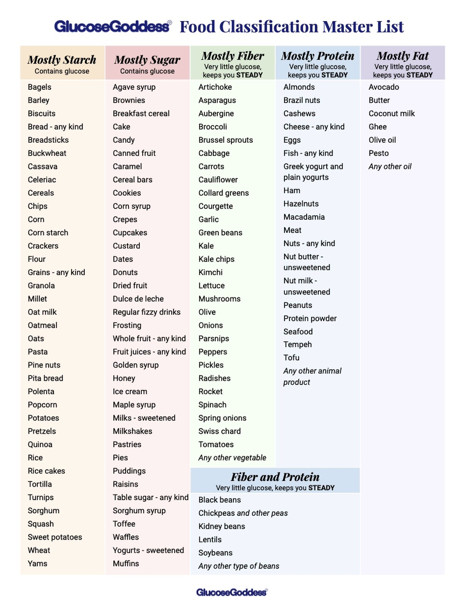Всем привет! Мне очень понравилась картинка, распределяющая продукты по преобладанию в них: крахмалов, сахаров, клетчатки, белков или жира. Автор предлагает выстраивать идеологию суточного рациона с учетом этих сведений, предполагая, что это позволит избежать резких скачков глюкозы и, как следствие, предупредить развитие инсулинрезистентности. Берите, переводите, пользуйтесь! Усилия окупятся! Рекомендации: Завтрак: сосредоточьтесь на белках и жирах. Плюс немного клетчатки, если хотите. Можно добавить немного крахмала для вкуса, и никакого сахара, за исключением цельных фруктов для вкуса. Овощные закуски: необходима клетчатка. Белки и жиры будут хорошим дополнением Основные блюда: могут представлять собой комбинацию белков, жиров, клетчатки и крахмала. То есть, можно все, кроме сахаров! Перекусы: работают крахмал, белок, жир и клетчатка, избегайте сахара, за исключением цельных фруктов. Десерт: это место, где можно понаслаждаться сладеньким, если хотите. Десерт после еды — это, пожалуй,