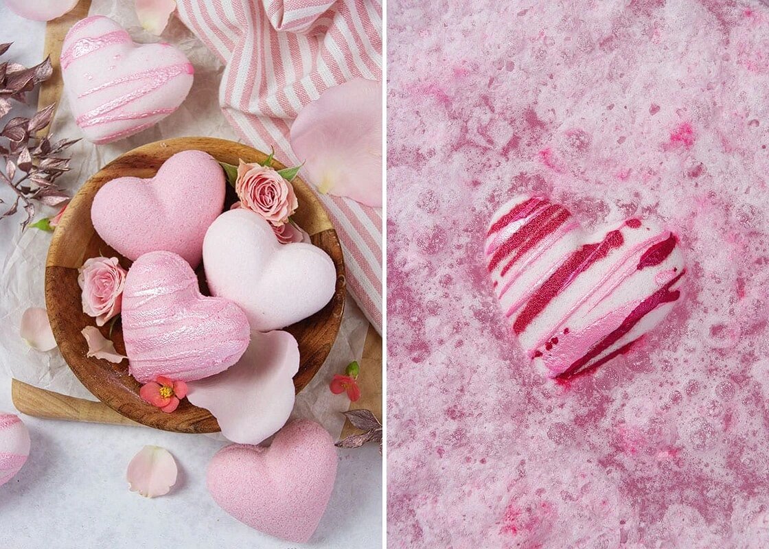 Освоившись, вы быстро поймете, какую важную роль играют интересные и удачные формочки. Изделие может смотреться очень эффектно, если использовать необычную форму, но вам даже не понадобится видео, как сделать бомбочку для ванны своими руками, — настолько всё просто! Смешайте сухие ингредиенты, хорошо перемешайте, чтобы не было комочков. Растопите масло ши на водяной бане или в микроволновке, слегка остудите, а затем добавьте Полисорбат 80 и эфирные масла. Смесь влейте в сухие ингредиенты и хорошо перемешайте. Сбрызните массу водой (очень аккуратно) или спиртом из спрея и тут же начинайте ее вымешивать. Консистенция должна быть как у мокрого песка, а масс должна при сжатии держать форму. Наполните обе половинки формы массой, немного с горкой. Сложите половинки и хорошо сожмите. Аккуратно снимите верхнюю половинку и оставьте бомбочку в нижней на 4−6 часов. Чтобы добавить на сердечки «глазурь», как на фото, смешайте 1 ч.л. пудры мика и 1 ст.л. спирта, перемешайте до однородности. С помощь
