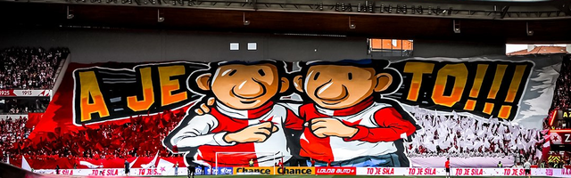 Начать сегодняшний обзор я предлагаю с Чехии, где очередную красоту продемонстрировали уже полюбившиеся многим читателям фанаты пражской «Славии». На домашке против пльзеньской «Виктории» столичные фэны уже в ранге новоиспеченных чемпионов страны (красно-белые не выигрывали первенство целых 4 года) презентовали прикольный перфоманс «И все!», на котором были изображены 2 крайне похожих друг на друга носатых персонажа в футболках «Славии».