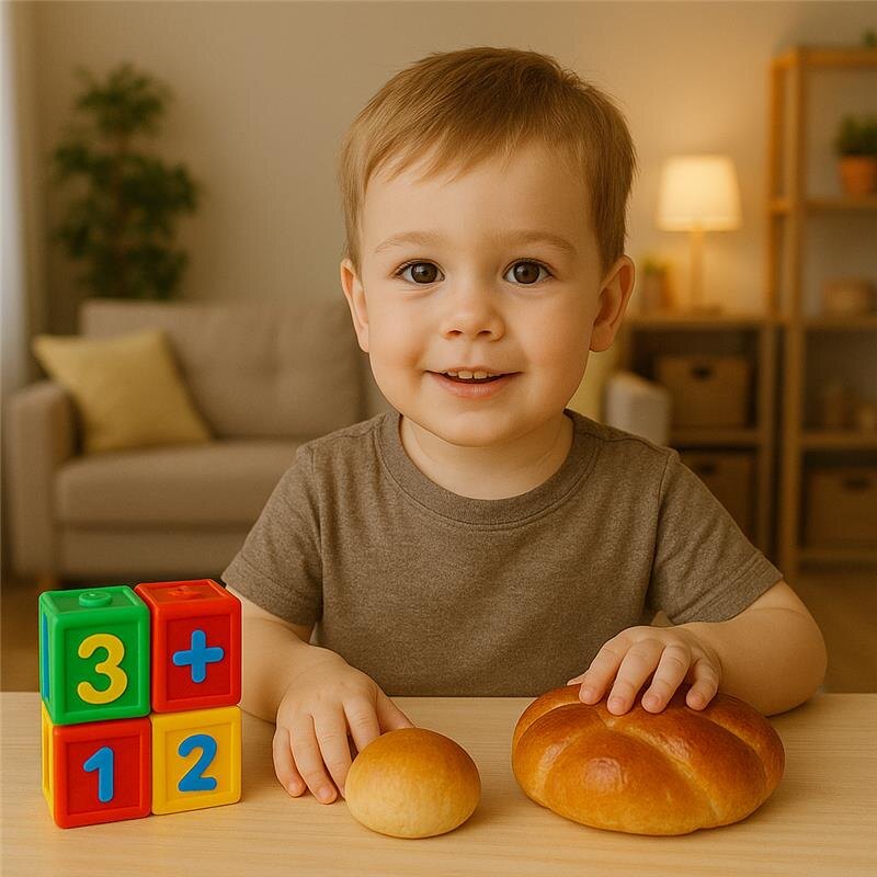Дело было на кухне. Я нарезала Даше яблочко, а рядом Миша с Максимом устроили настоящую дуэль: у кого кусочек булочки больше. Секунд пятнадцать стояли, глазели на тарелку, пока Миша не выдал: «Этот больше!» — и уверенно схватил победителя. А у меня в голове как будто щёлкнуло. Это ж оно! Началось! Его первое число, первая оценка количества. И никакого «раз, два, три». Просто — «этот больше». . Всё это мне так напомнило недавнюю статью, которую я прочитала — там рассказывается, как у детей развивается числовое мышление. Что сначала идёт понимание много-мало, больше-меньше, потом уже учатся считать, и только потом — понимать, что 5 — это не просто слово между 4 и 6. И мне прям захотелось поделиться этим. Потому что вот, казалось бы, малыш просто выбирает побольше. А на самом деле — это его первый шаг к математике. Не к задачкам с поездом и бассейном (хотя и до них дойдём), а к настоящему пониманию количества. К сравнению. К логике. С тех пор я стала обращать внимание на такие моменты. Ка