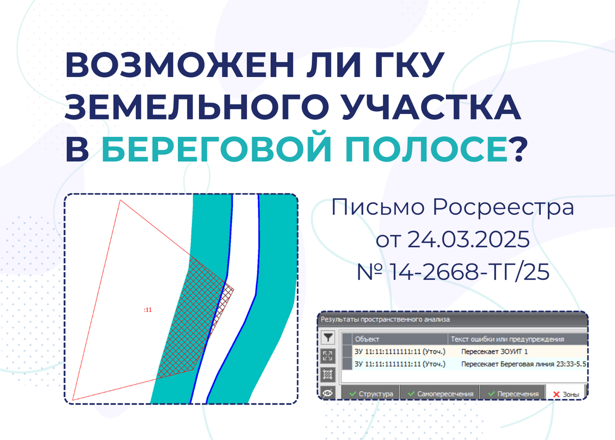 На сегодняшний день в законодательстве РФ отсутствует единый подход к нормативному регулированию установления береговой полосы водных объектов: С одной стороны, береговая полоса внутренних водных путей относится к зонам с особыми условиями использования территорий (ЗОУИТ) согласно Схеме территориального планирования РФ в области федерального транспорта и автомобильных дорог федерального значения С другой: Тем не менее п. 8 ст. 27 ЗК РФ содержит прямой запрет на оформление в частную собственность ЗУ в границах береговой полосы. Как поступит регистратор при выявлении пересечения границ ЗУ с береговой полосой? Приостановит ГКУ согласно п. 7 ч. 1 ст. 26 218-ФЗ, если кадастровые работы проводились в отношении ЗУ, предоставленного в частную собственность до 30.10.2001 (до вступления в силу ЗК РФ) Основания для приостановления отсутствуют, если ЗУ: Как предварительно оценить расположение ЗУ относительно береговой линии и береговой полосы? Режим «Графика» в «ТехноКад-Экспресс» позволяет: выяви