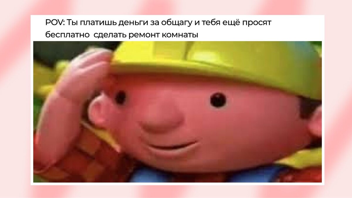 по закону вуз действительно может требовать от студентов провести косметический ремонт: например, побелить стены или починить сломанную тумбочку. Но только если в договоре и внутренних правилах общаги не указано иное — внимательно изучите документы и ссылайтесь на них, если вас заставляют делать ремонт. Кроме того, при заселении студенты обычно заполняют бумажку с перечислением всех неисправностей, которые остались в комнате от прошлых жильцов. Требуйте ее от вуза, если помните, что прописывали дефекты там. 🔴 Что делать, если вуз все равно требует провести косметический ремонт? Обратиться в деканат и ректорат, а если не поможет — в комиссию по урегулированию споров. Если внутри вуза проблему решить не удается — можно идти в прокуратуру или в суд. Если вас заставляют делать ремонт за свой счёт под угрозой выселения или отчисления — напишите нам на бесплатную горячую линию в телеграме, юристы помогут защитить ваши права.