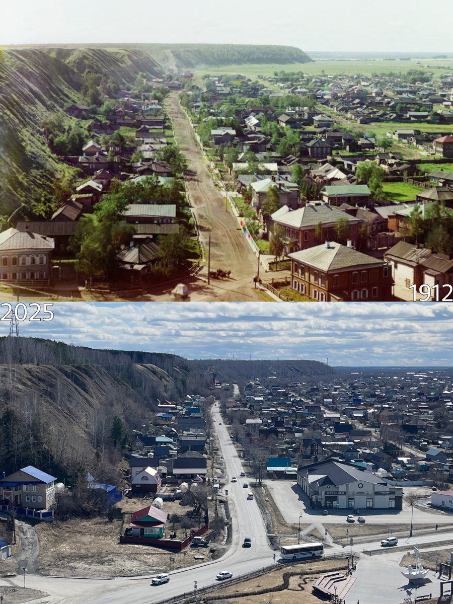 В Тобольске до революции сделал целую серию фотографий фотограф С.М. Прокудин-Горский. Он оставил замечательные снимки древнейшего русского города в Сибири. Давайте посмотрим на них в формате было/стало. Заметили, что старых деревянных домов почти не осталось? Гид рассказала, что в свое время многие поджигали свои дома, чтобы получить компенсацию и переехать в новые квартиры в современной части города. Так что активно старые дома исчезают с панорам Тобольска. На этом снимке это хорошо видно. Это снимок могучей реки Иртыш. Раньше она разливалась намного сильнее. Чтобы повторить этот снимок мне пришлось перелезть через забор и скатиться с горы! Но столько проехать и не повторить этот снимок было непозволительно. В кадр попал польский костел. Тобольск был ссыльным городом, поэтому тут проживало много поляков, которых отправили в Сибирь. Отсюда и собор! Какое чудо, что Прокудин-Горский подарил нам такие кадры. Здесь на кадре местный краеведческий музей. Жаль, что в понедельник он не рабо