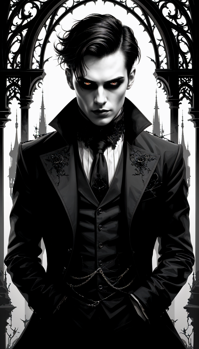 Нарисуй 9:16: человек, готический и тёмный фэнтези стиль, мечтательный, векторная иллюстрация, 3d, профессиональный, гладкий, современный, минимализм, графика, штриховая графика