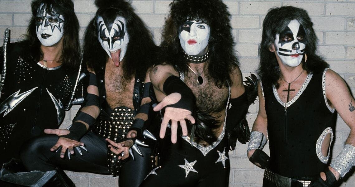 Kiss дали свой первый концерт 30 января 1973 года в Popcorn Club (позже Conventry) в Саннисайде, Квинс, при незначительной явке. Группа изначально пыталась перенять глэм - панк андрогинный облик рок-группы New York Dolls, но посчитал, что имитация лишена оригинальности и честности. Вместо этого группа начала надевать черно-белый клоунский грим в стиле Кабуки . Каждый участник придумал себе другую личность, чтобы дополнить свою раскраску лица; Симмонс стал Демоном, Стэнли — Звездным Дитятем, Фрейли — Космическим Тузом (или Космонавтом), а Крисс — Человеком-Котом. В августе того же года на концерте в Hotel Diplomat на Таймс-сквер Kiss привлекли внимание Билла Окойна, который стал их менеджером. Окойн купил группе дым-машины, барабанный подъемник и костюмы из спандекса. Он также помог группе подписать контракт с зарождающейся компанией Casablanca Records, которая выпустила одноименный дебютный альбом Kiss в феврале 1974 года.