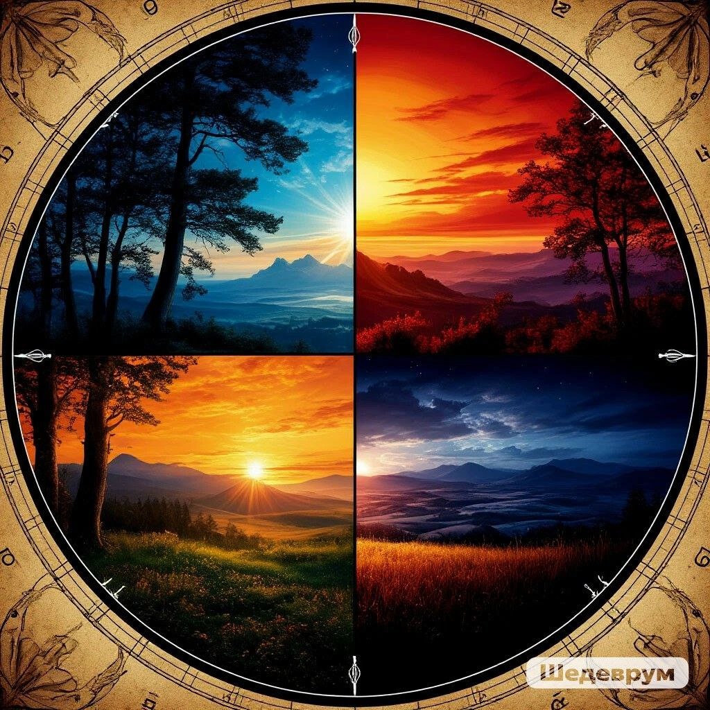 Год делят на четверти 4 переходных явления: два солнцестояния и два равноденствия. Точно также на четверти можно разделить и сутки: рассвет, закат, полдень и полночь. Эти моменты являются наиболее благоприятными для магической практики. Фольклор донёс до наших дней много поверий, связанных с ними. Боги, олицетворяющие день, ночь, а также рассветы и закаты относятся к одним из самых древних. И зачастую Боги-Демиурги не имеют над ними власти. Полночь — точка, в которой наиболее сильна ночь, а также ночные духи и Боги, а полдень — точка максимальной силы дня и Солнца и соответствующих духов и Богов. Причём в жарких странах, Солнце несёт не только и жизнь и блага, но может представлять и опасность. Рассветы и закаты — время перехода власти от одних сил к другим. Все 4 поворотных момента суток — время когда можно с наибольшей лёгкостью проникнуть их мира плотного в мир тонкий. Только помните, что настоящие астрономические полночь и полдень не совпадают с теми, что на часах. Для того