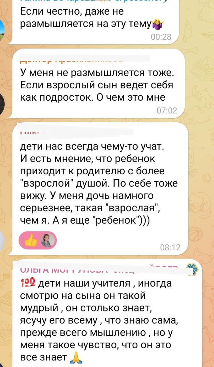 Очень здорово, что есть разные мнения. Постепенно попробую объяснить. Взрослый ребёнок (18+) - это самостоятельная единица. Его поведение - это уже его зона ответственности, и та история , которую он проживает, она с ним не просто так. Однажды было принято решение (им или родителями), которое запустило весть процесс и привело к тому, что есть сейчас. Говоря о том, что дети нам отражают что- то или показывают, речь идёт о несовершеннолетних. Это тот период, когда они находятся в поле родителей и их поведение так или иначе ориентировано родителям. Дети в семье- как гирька на весах, ⚖️ помогают уравновесить и удержать баланс. (Например ,заболевают, попадают в беду, чтобы вернуть в семью маму или отца) И самое главное, дети - это ресурс, особенно для мужчины. Я уже писала о том, что быть "нехорошим" это наименьшее зло. Т.е.поведением , которое нам взрослым не нравится, ребёнок вредит себе меньше, чем если бы делал так как положено .Поэтому, когда ребёнок не слушается, активно соп