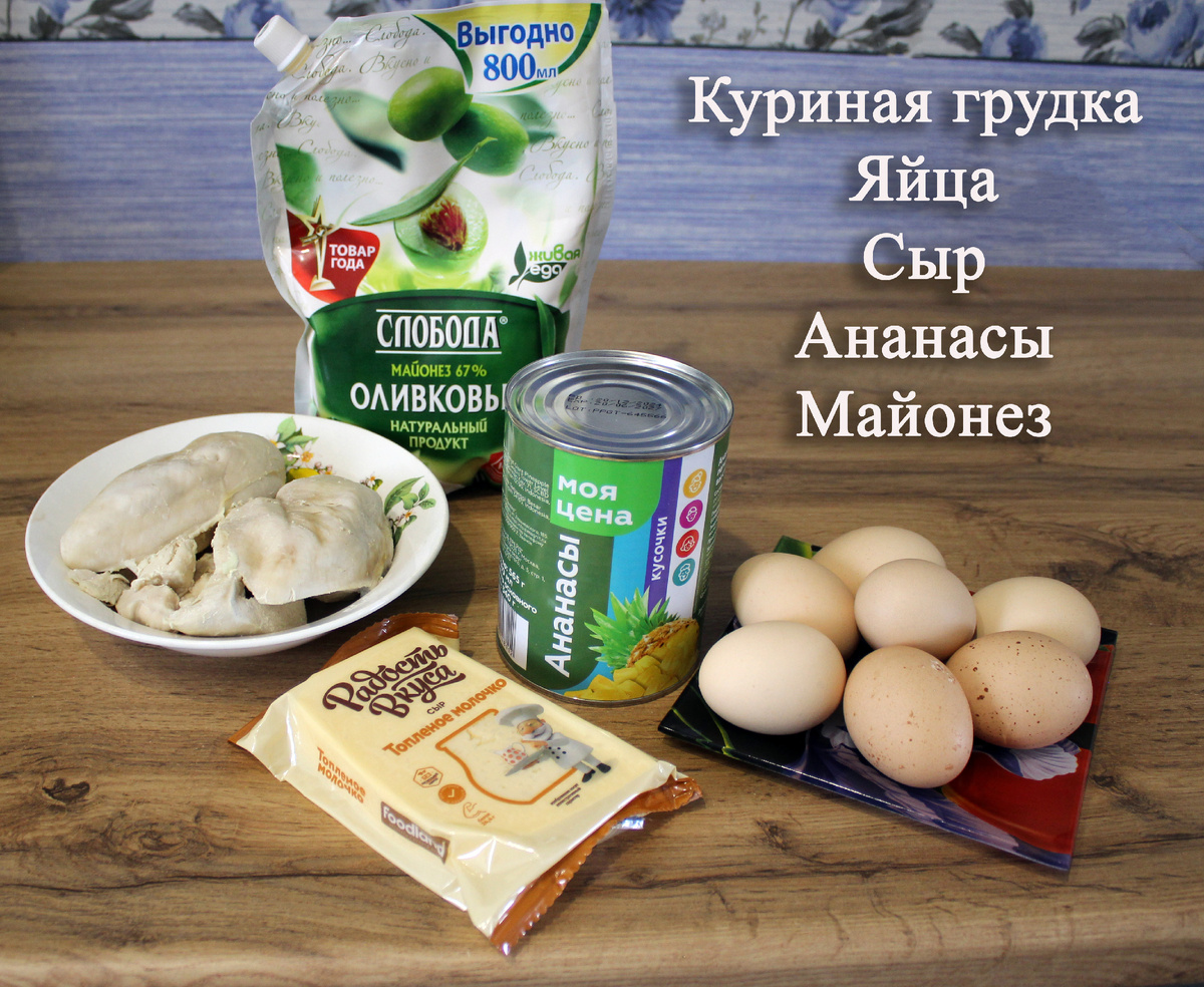 Всем привет! 👋 Мы с мужем очень любим этот простой салат. Готовим его почти на все праздники. Делюсь с вами рецептом 😉 Грудку нарезать кубиками, сыр натереть на крупной тёрке, яйца пропустить через яйцерезку. Ананасы обычно покупаю кусочками, поэтому их просто высыпать в чашку (предварительно слить с них сок, конечно же). Заправить майонезом, перемешать и дать пропитаться часа 2-3 в холодильнике. Салат готов! Мама в моём детстве делала этот салат слоями: курица, яйца, сыр, ананасы, между слоями - майонез. Но мне перемешанный вариант больше нравится: так курица лучше пропитывается ананасом. Попадались мне и варианты с добавлением грибов или кукурузы, а также орехов. Но на мой вкус это лишнее! Пишите комментарии, ставьте 👍, подписывайтесь на канал, чтобы не пропустить новые публикации! Спасибо за внимание!
