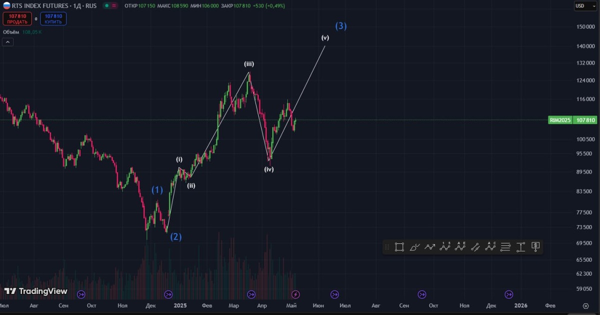 RTS Продолжаю держать российские акции в надежде на продолжение волны (3) В районе 130 000 - 140 000 планирую фиксировать прибыль, поскольку ожидаю довольно существенную коррекцию в волне (4)