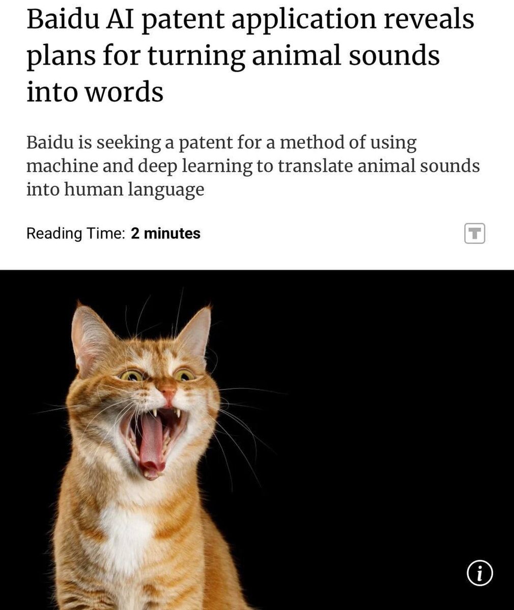 Люди смогут понимать кошек: китайских бигтех Baidu разрабатывают ИИ для перевода звуков животных слова Нейросеть проанализирует голос, язык тела и поведение, чтобы преобразовать его в понятные фразы. Возможно, технологию внедрят в «умные ошейники».