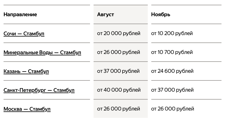 Из России в Стамбул есть много прямых рейсов и не только из Москвы. В списке около 20 городов, например Сочи, Махачкала, Казань, Минеральные Воды, Санкт-Петербург, Уфа, Красноярск, Тюмень. Но самые дешёвые билеты на прямые рейсы в низкий сезон, например, если полететь с конца октября до начала декабря или с февраля по март.